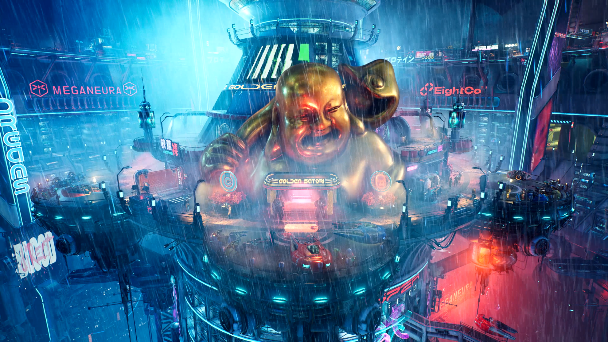 It’s also a world dense with the grimy details and paraphernalia of a lived-in space, one where different cultures go about their day. There’s so much clutter in every frame in The Ascent, and I love it for it. The game uses this to create a believable world, and in conveying how affluent this or that neighbourhood is. You’ll know you’re in the lowly boroughs when garbage bags outnumber people and disrepair is the norm. It wasn’t until I reached the very top – ascended – that this picture of disparity really sunk in. Your strolls across these areas will usually be accompanied by some of the best ambient electronic music in the genre, including a certain piece paying homage to a classic.